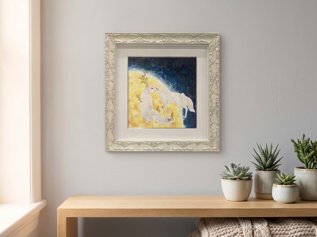 月と聖なる四獣 「玉兎」(ぎょくと) 夜も深いころ、吉祥文様を纏った白い獣たちが戯れます。 思いのままの在り方を表現したくて獣の姿を借りました。 深い夜の青は六色の絵具を、月は四色、動物たちは七色を複雑に盛り重ね、同時焼成で仕上げています。 絵具の滲みや重なりが焼成の際に溶けあって、幻想的で複雑な色味を描きだしました。 陶芸美術 絵付師 指方裕美作品 陶雅 連作「玉兎」ぎょくと 焼物の絵画 陶雅作品です。太陽光に当たると更に色鮮やかに輝きます。 直射日光、湿度等関係なく飾っていただけます。 絵寸 197×197㎜ 額サイズ 約320×320㎜ 重さ  2㎏未満 ※壁掛け用のフックを一緒にお付けします。 ※作品は液晶画面、デバイス等により色彩が違って見える場合がございます。  あらかじめご了承ください。